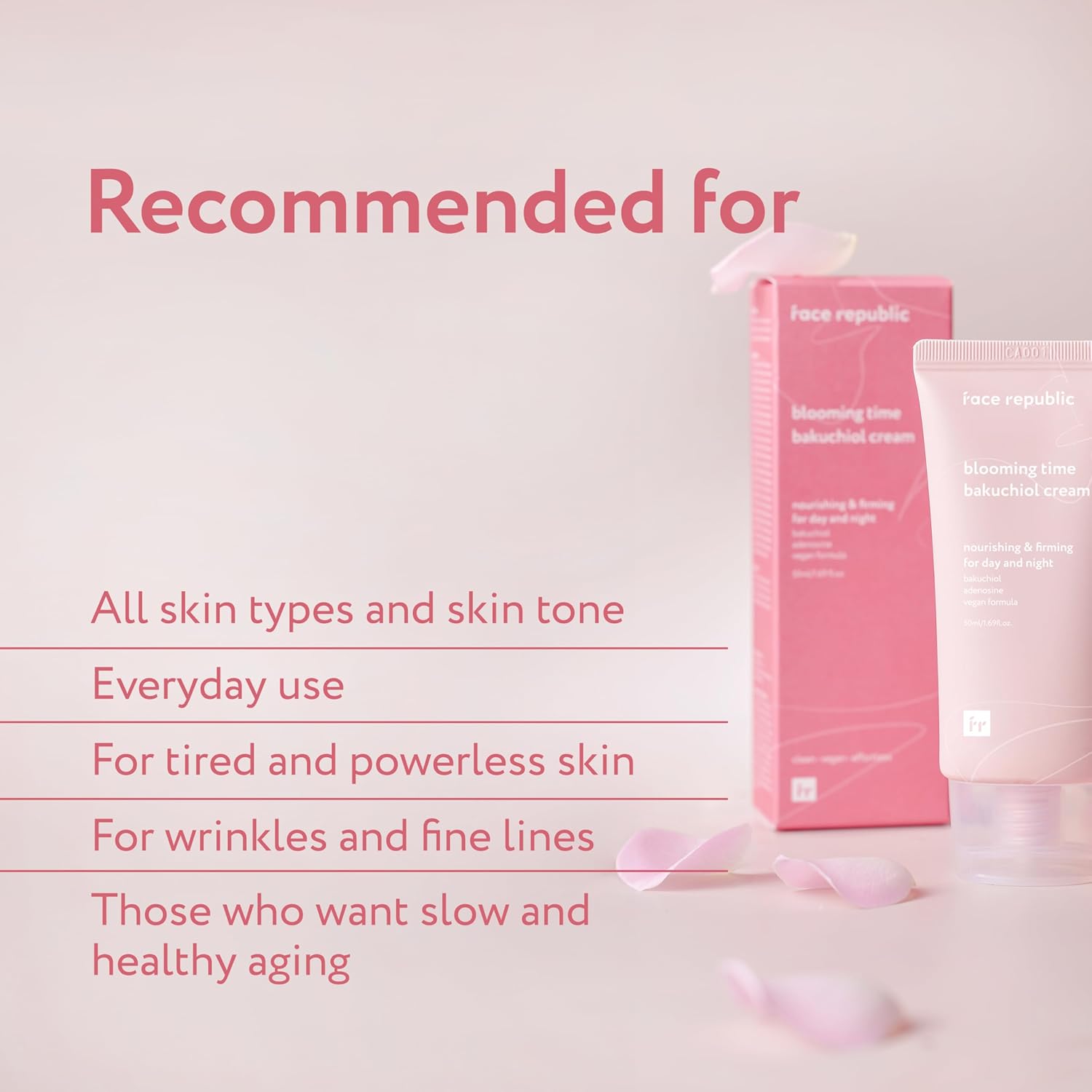 Face Republic Blooming Time Bakuchiol Cream 50 ml es una crema facial de día y de noche diseñada para mejorar firmeza, elasticidad y textura con bakuchiol (5,000 ppm), una alternativa vegetal al retinol ideal para quienes buscan un enfoque anti-edad más gentil. Su textura tipo “lotion” se absorbe rápido y deja la piel suave, hidratada y con apariencia más rellena, sin sensación pegajosa.